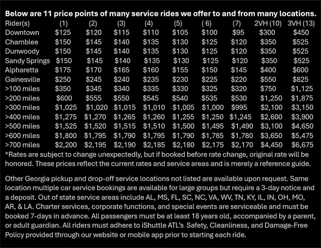 Travel from Atlanta suburbs to Atlanta airport, fine dining, and local events in style and comfort.